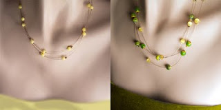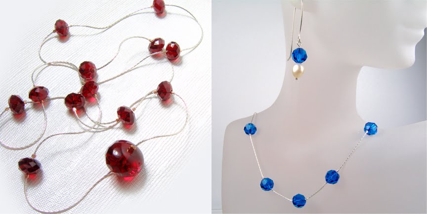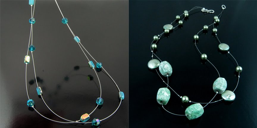 Since then, I've strung delicate snake chain & fine beading wire through my favorite stones many times. Spacing them equally with a pinched, tiny crimp is a tricky, tedious business-- & hard on the eyes. Stringing multiple strands, with beads placed so they appear "balanced," is much easier. Illusion (aka "floating") jewelry remains a big favorite of mine and my customers. I suspect we all need a little Magic in our lives...