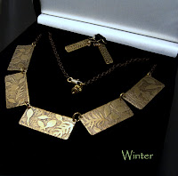 First, the bad news. I nursed plantar fasciitis as ordered, but since I wasn't improving, the doctor said NO WAY should I attempt fly fishing rivers on foot in remote New Zealand. (See post "How My Klutz Collection Came To Be.") So I immediately cancelled our dream trip & frankly went into a whiny funk. One night I dreamed of an etching project that got me back on track. And here it is. "Winter - Spring" is a reversible necklace - with my original designs etched on both sides of each brass panel. It's 2 necklaces in one. The chain is beautiful, coated brass by Vintaj. I made matching earrings. So this creation comes with a story that ends happily... sort of...